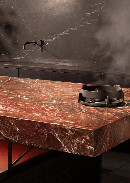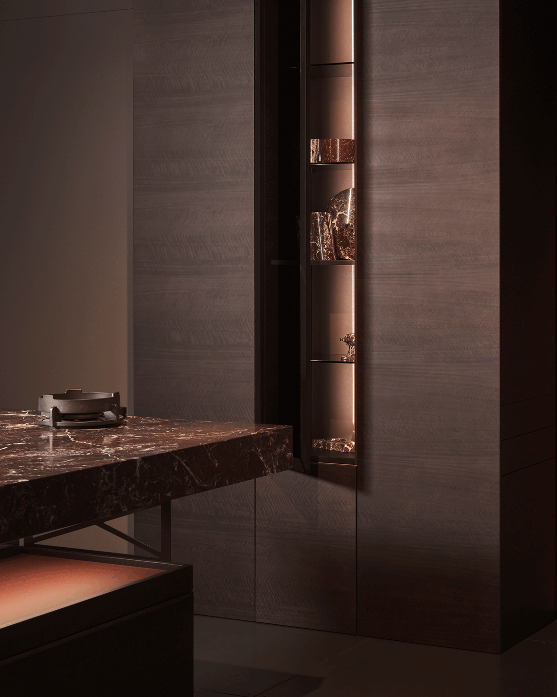 +MODO impresses in its play with dimensions. Worktop and cabinetry are offset against one another to form an exhilarating constellation. Pull-out shelves also play with the idea of offsetting space. In the unmistakable design language of Jorge Pensi, the worktop spans the cabinets below appearing to float. The resulting free space becomes a stage for utensils and personal accessories.