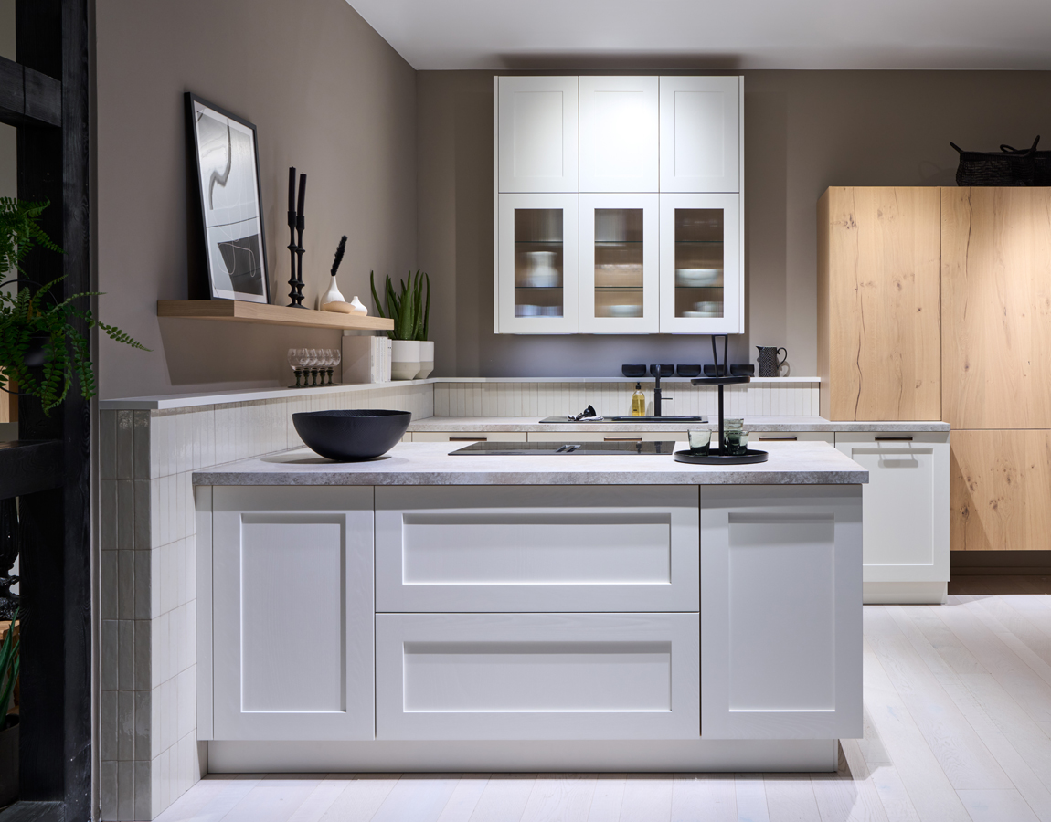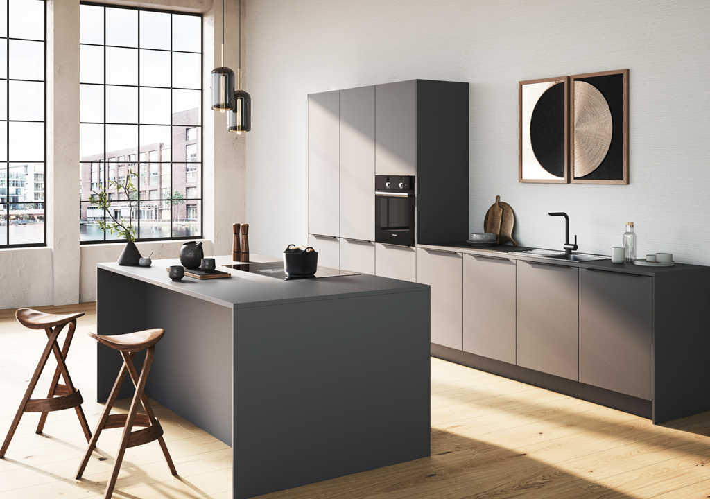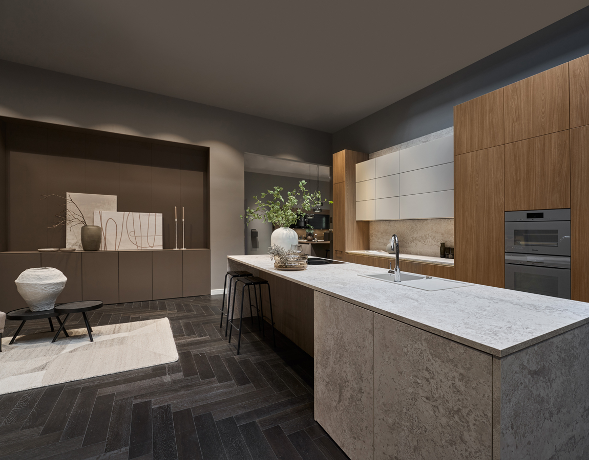 展示於德廚集團台北忠孝店的 Systemat 系列,為品牌旗下最高階廚具產品線,主打精緻設計與高度客製化彈性。系列採用 SLD 纖薄抽屜系統與感應式燈條設計,在極簡比例下兼顧收納容量與使用便利性,特別適合小宅與開放式空間配置。材質運用上,結合工業鋼金屬烤漆與橡木實木貼皮,透過金屬理性線條與天然木紋的溫潤質感,平衡機能性與生活美感;同時導入如日式燒杉等傳統工藝概念,進一步強化材質的耐用性與視覺層次,展現德國在工藝與設計上的深厚實力。