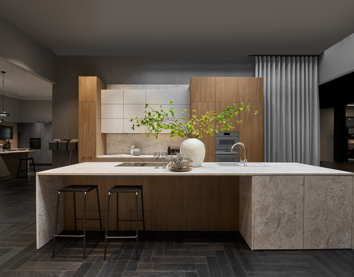 針對高端住宅與小坪數、開放式空間常見的收納與動線挑戰,Häcker的 Systemat系列透過更深的櫃體規劃、SLD纖薄抽屜系統與感應式燈光配置,在最佳比例中創造出109%的實際收納量,使廚房在視覺上保持俐落,且同時滿足高頻率使用需求。材質選擇上,涵蓋單板、天然石材、亞麻油氈、金屬烤漆等高階門板飾面,極豐富的選擇可按照需求與喜好,組裝出20-30種不同風格的廚房。Systemat的精緻客製設計,與廚房規劃的高度靈活性,讓即使是小坪數空間,也能兼顧機能、秩序與整體美感。