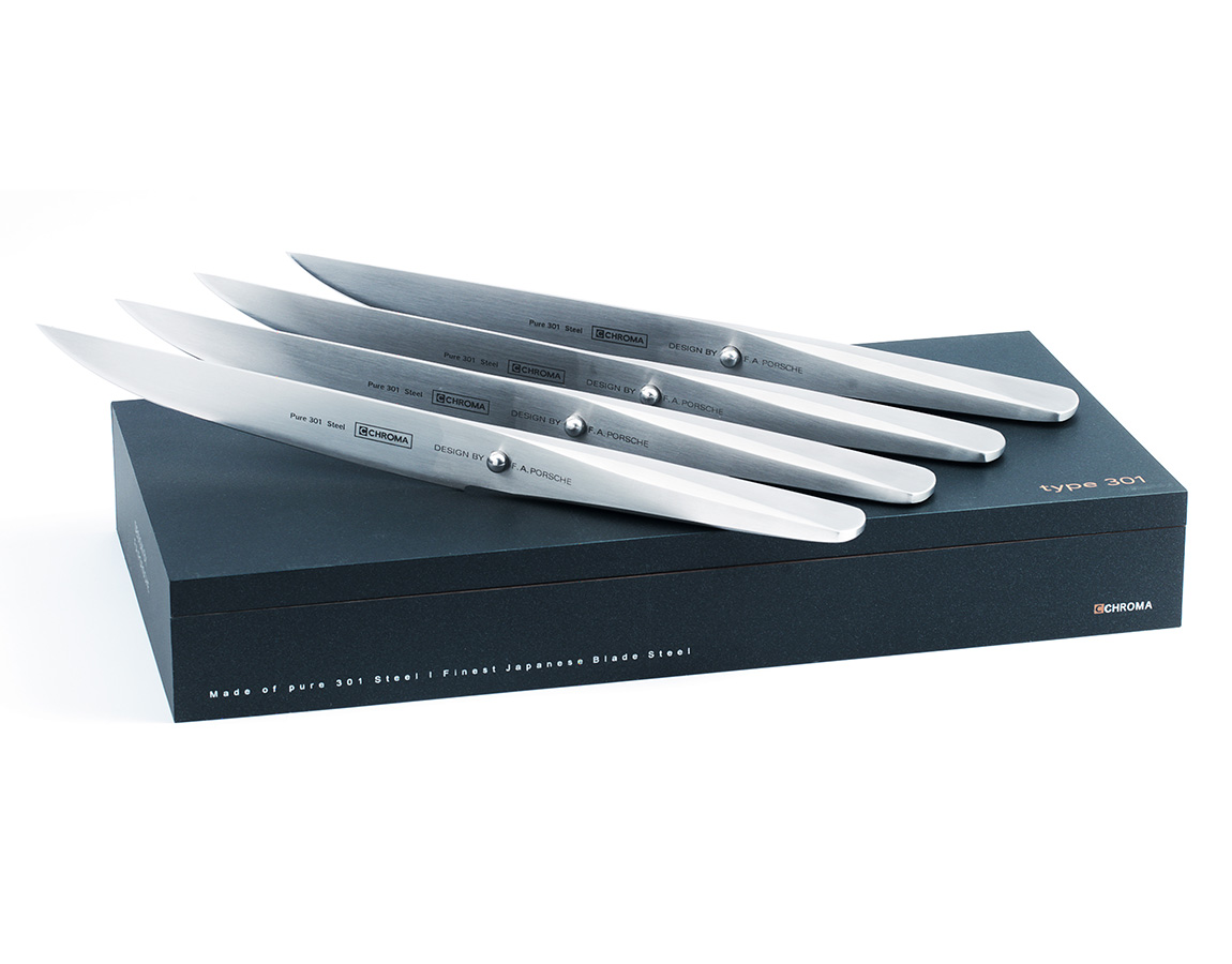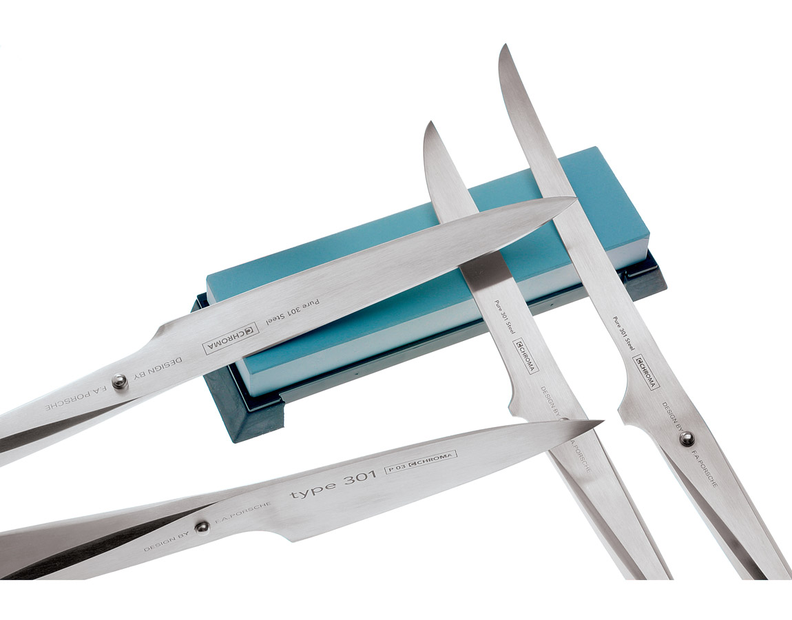 Chroma刀具系列-刀片採用高品質的日本301鋼,刀柄則由18/10不鏽鋼材質製成,透過焊接無縫結合,安全衛生無虞。鑄刀師傅使用三角鑽頭的特殊磨光技術,增強刀片的堅韌度,使鋒利的刀刃持久如新。