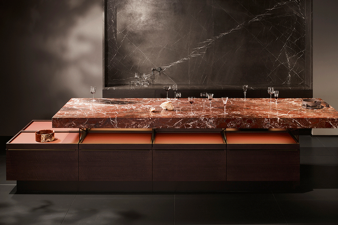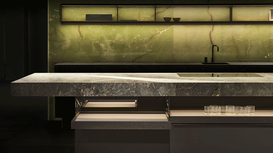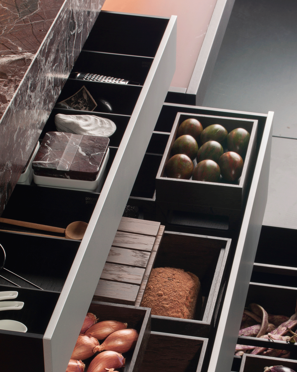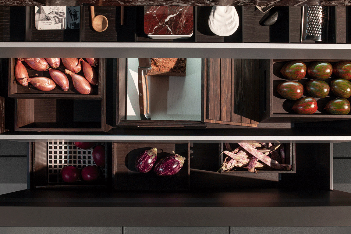 +MODO impresses in its play with dimensions. Worktop and cabinetry are offset against one another to form an exhilarating constellation. Pull-out shelves also play with the idea of offsetting space. In the unmistakable design language of Jorge Pensi, the worktop spans the cabinets below appearing to float. The resulting free space becomes a stage for utensils and personal accessories.