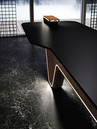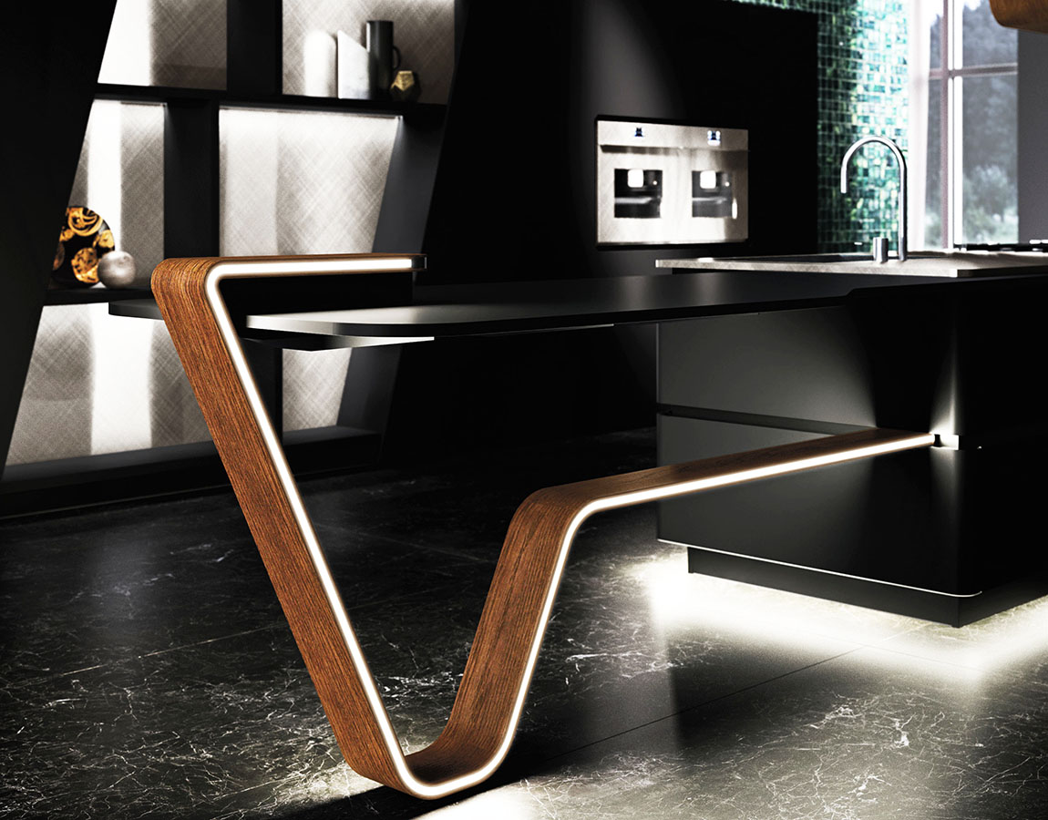 其以實木製作的中島桌腳,結合LED燈帶的延伸視覺設計,不但極為亮眼,與整體櫥櫃的斜角邊線設計更互為呼應,形成對稱之美。