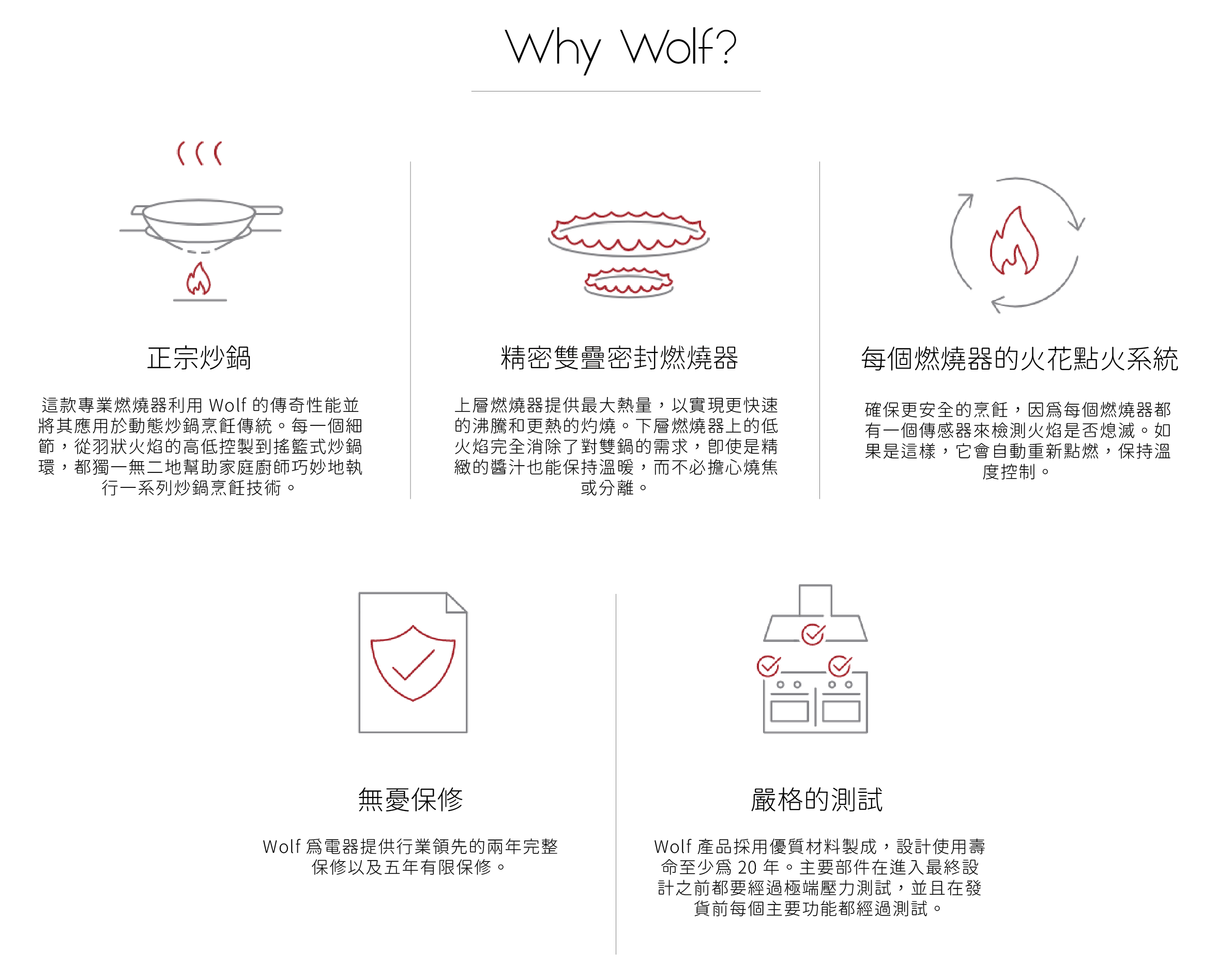 ‧ 標配 P 型紅色旋鈕(強烈的 Wolf 爐具識別)