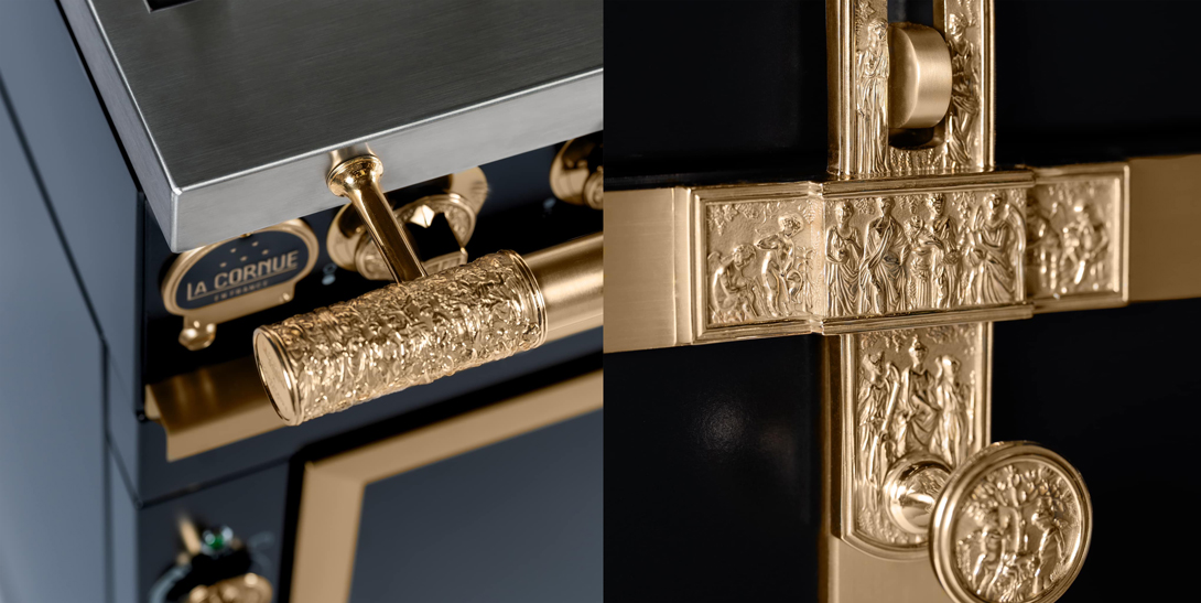 La Cornue與Tournaire攜手創作了名為「La Vie」的浮雕雕塑系列,這些雕塑精美地裝飾在La Cornue經典的Château系列上,頌揚日常生活中的純粹美好。這些作品運用了古老的鑄造技術,每一個細節都經過精心雕琢,細膩地展示人物的表情和動作,營造出情感豐富的場景。