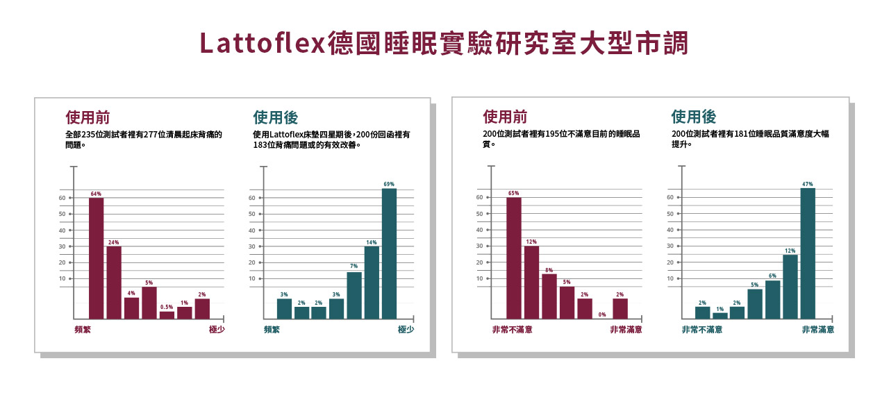 200份測試者中有195位不滿意目前的睡眠品質,使用Lattoflex床墊四星期後,200份回函中有 181 位的睡眠品質滿意度大幅上升。