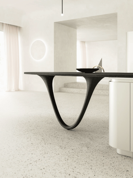 廚房半島的吧台區將弧形曲線應用的淋漓盡致,黑色支撐腳沉穩的平衡檯面,又以躍動靈活的線條舞動出優雅不凡的藝術氣息。