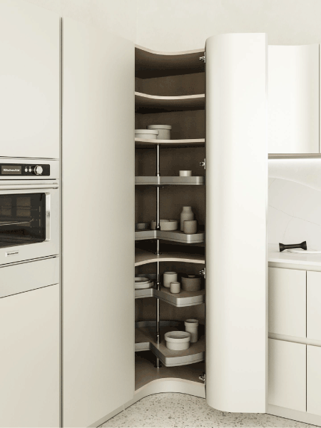 手感滑順的高櫃延續設計師無直角的設計理念,弧形線條型塑出流動的門板,去除掉櫃體的份量感也增加溫婉靜雅的氛圍。各式拉籃的組合系統兼顧了收納實用性與美觀設計感。