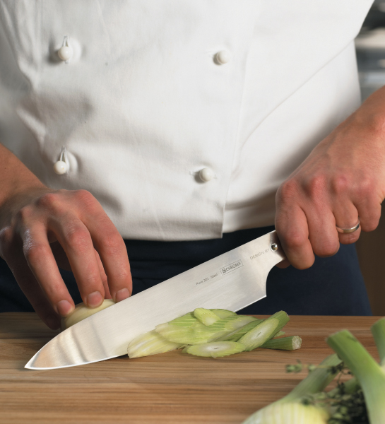 CHROMA TYPE 301 是與知名的跑車 PORSCHE Design 合作研發,採用人體工學的握把,刀刃與刀柄以兩種不同的材質焊接結合,加上刀深的無縫設計,更能展現CHROMA德國絕佳工藝。三角鑽頭的特殊磨光技術可讓刀具長期保持鋒利,因此在切肉品時無須太過用力地來回切砍,只需輕輕地劃過即可將肉分離。