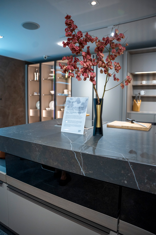 Poggenpohl 最令人印象深刻的系列之一+MODO漂浮廚房也以嶄新的姿態進駐德廚集團台中惠中門市,在開放空間中散發著獨特的大器和迷人的奢華,不對稱的檯面設計突破空間維度,抽拉式置物架也體現了空間位移的概念,使整座中島廚房成為家中的主角,為近年崛起「社交型廚房」的典範。