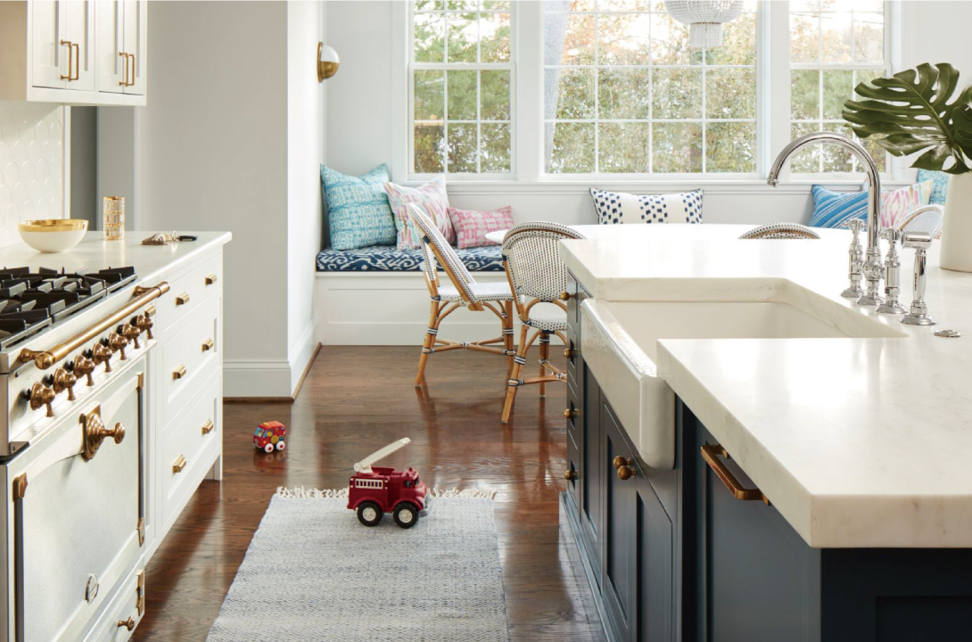 在現代廚房中看到越來越多的暖色調黃銅。黃銅是增強寶藍和墨綠色櫥櫃的理想色調,同時增添精緻感。黃銅製的水龍頭、鉸鏈、旋鈕和把手可以畫龍點睛,作為整體設計的最後的潤色。