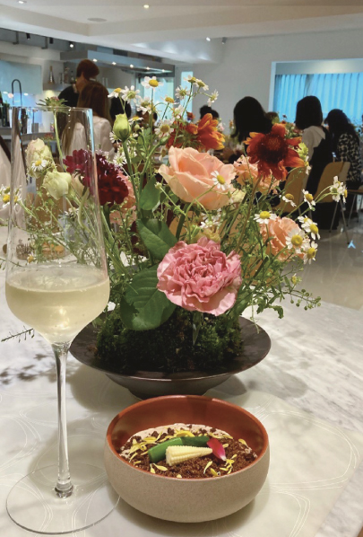 完成桌花後,桌面上的插花器具換成用餐餐具,瞬間從午後花園轉換成了午後「食」光。由德廚私廚端上的珍稀菜單「感官花園」,是使用20道醜蔬果和10種工法料理而成的功夫沙拉。「感官花園」與德國花藝保留植物純粹的理念不謀而合,同樣藉由食材最自然的樣貌,透過精巧的手藝交織成多樣味蕾,一口一口既樸實也驚豔。