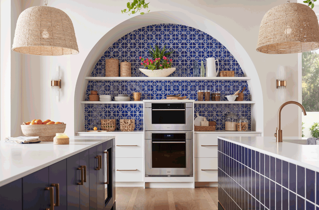通常廚房壁櫃與中島檯面會呈現垂直軸線或水平軸線,以呈現中島的俐落線條。但如果想讓廚房呈現較活潑休閒的輕鬆氣氛,建議將牆面打造出一座拱門儲藏櫃,搭配擁有同樣柔軟的曲線的鐘型吊燈,與藍白印花磁磚,彷彿在地中海沿岸聽著海浪歡快的料理夏日晚餐。要注意的是,拱形壁櫃比一般直線型壁櫃的收納空間還少,如其他收納空間充足,可考慮投資一座亮眼的拱形壁櫃。