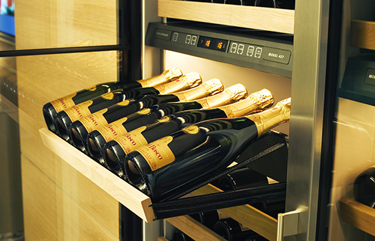 一般人往往用冰箱儲藏葡萄酒。但是冰箱缺少防震設施,而震動會加速葡萄酒的化學反應,進而影響葡萄酒的熟成。因此最好能挑選有靜音低震盪懸臂式壓縮機固定設計的專業酒櫃,安靜的壓縮機可讓美酒不受擾動,藉由層架以平順的滑動方式取用,保留美酒應有的風味。