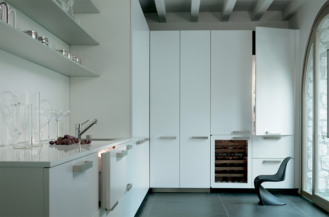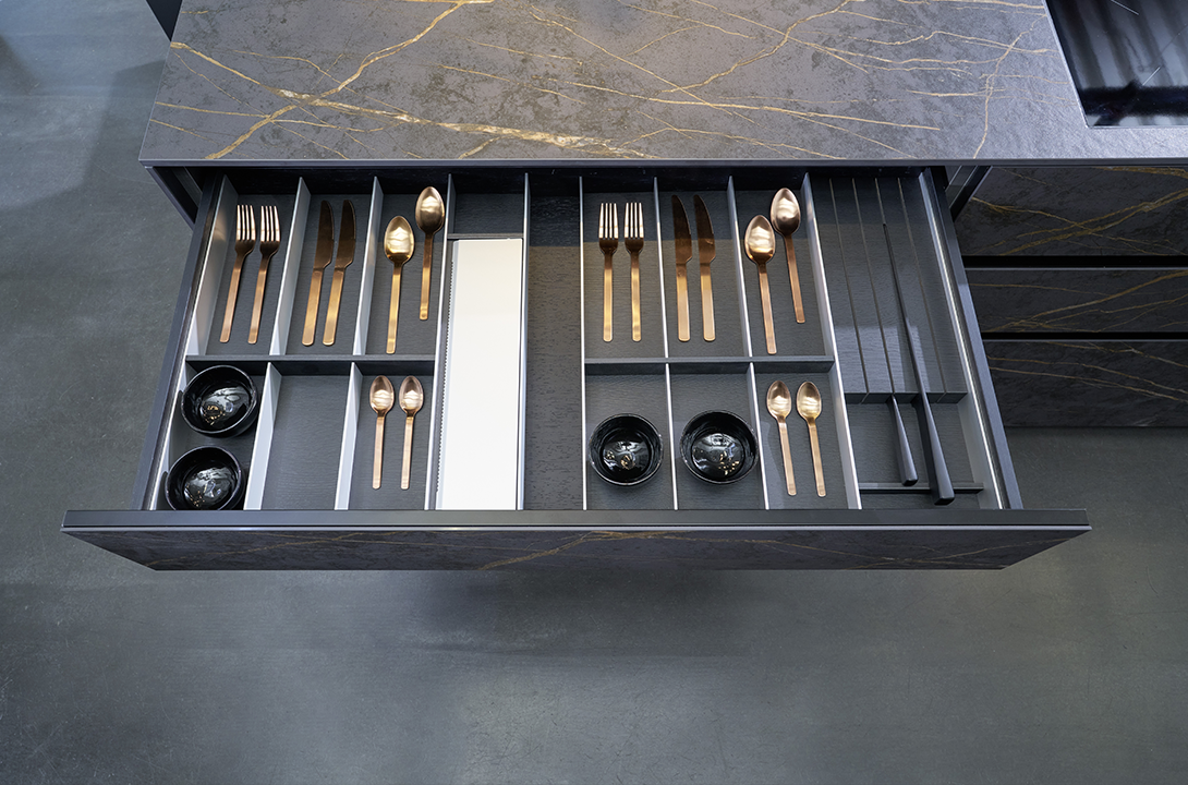 廚具客製化的細節可調性非常高,除了針對主要烹飪者的身高來決定櫥櫃的高度,也可以針對左撇子來做廚具設計。總監特別提到,水槽才是第一優先決定檯面高度的設備而並非瓦斯爐,因為對於烹飪者而言,於洗手台切菜、洗菜、洗碗的時間遠比在瓦斯爐上炒菜、煮菜的時間多太多了,試著回想一下要做一道家常菜,備菜的時間可能需要45-50分鐘,但炒菜時間只需要5分鐘。另外,如果家裡不常進行烹調,首要高度設計則為煮水的瓦斯爐或是品酒的中島吧檯。所以還是需要針對使用者情境來去做出完美設計。