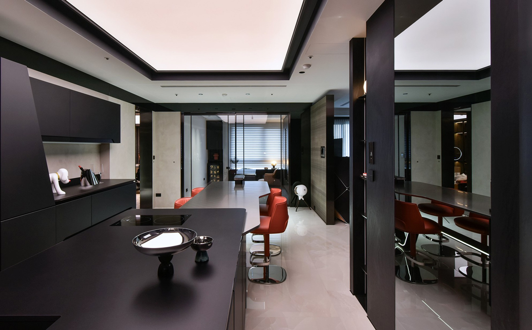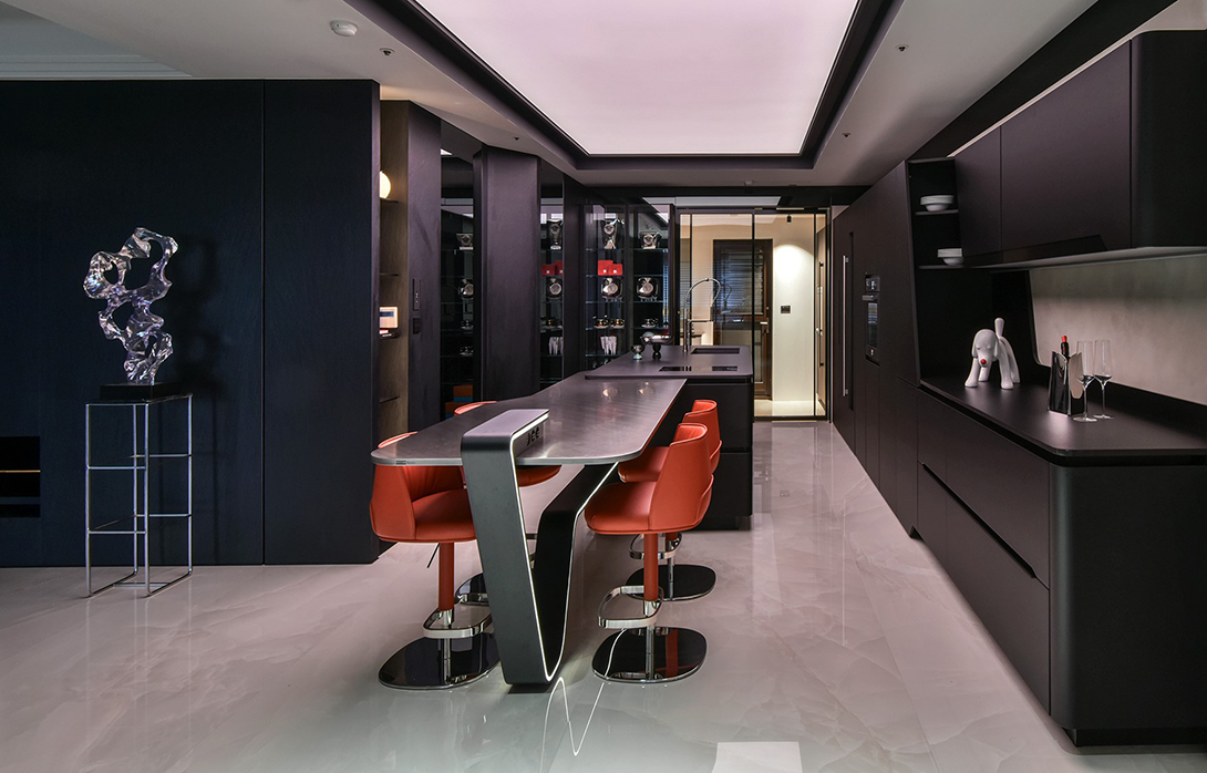 推薦業主在參觀了幾家頂級廚具商後,業主在德廚集團台中惠中店一眼相中了Snaidero的法拉利設計款Vision廚具。隨後,設計師根據廚房空間的格局及設定,將餐廳主牆規劃為廚具檯面特有的曲拆線設計,展現出空間沉默的動感和靜止中的動勢,完美襯托法拉利廚具的簡潔幹練時尚。
