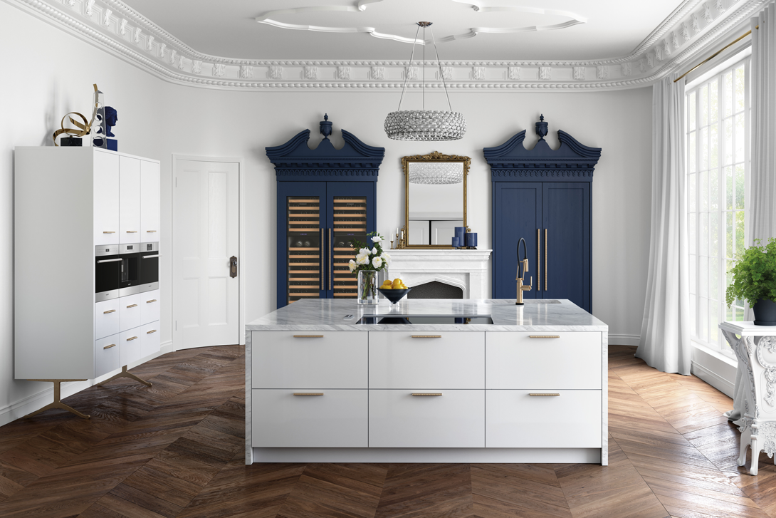 白色為廚房設計提供了完美的基礎,然而,如何融入個性在廚房設計中也是至關重要的。 白色廚房可以透過對比來產生難忘的戲劇性效果。安排廚房的一小部分來添加深色裝飾,例如在白色中島廚房搭配深木地板,有助於平衡白色牆壁和檯面的配色,產生更加戲劇性的效果。另外,利用風格強烈的櫥櫃增加趣味,例如在純白牆壁及純白廚房中加入深藍酒櫃與深木人字地板,讓白色廚房更顯潔白與高貴。